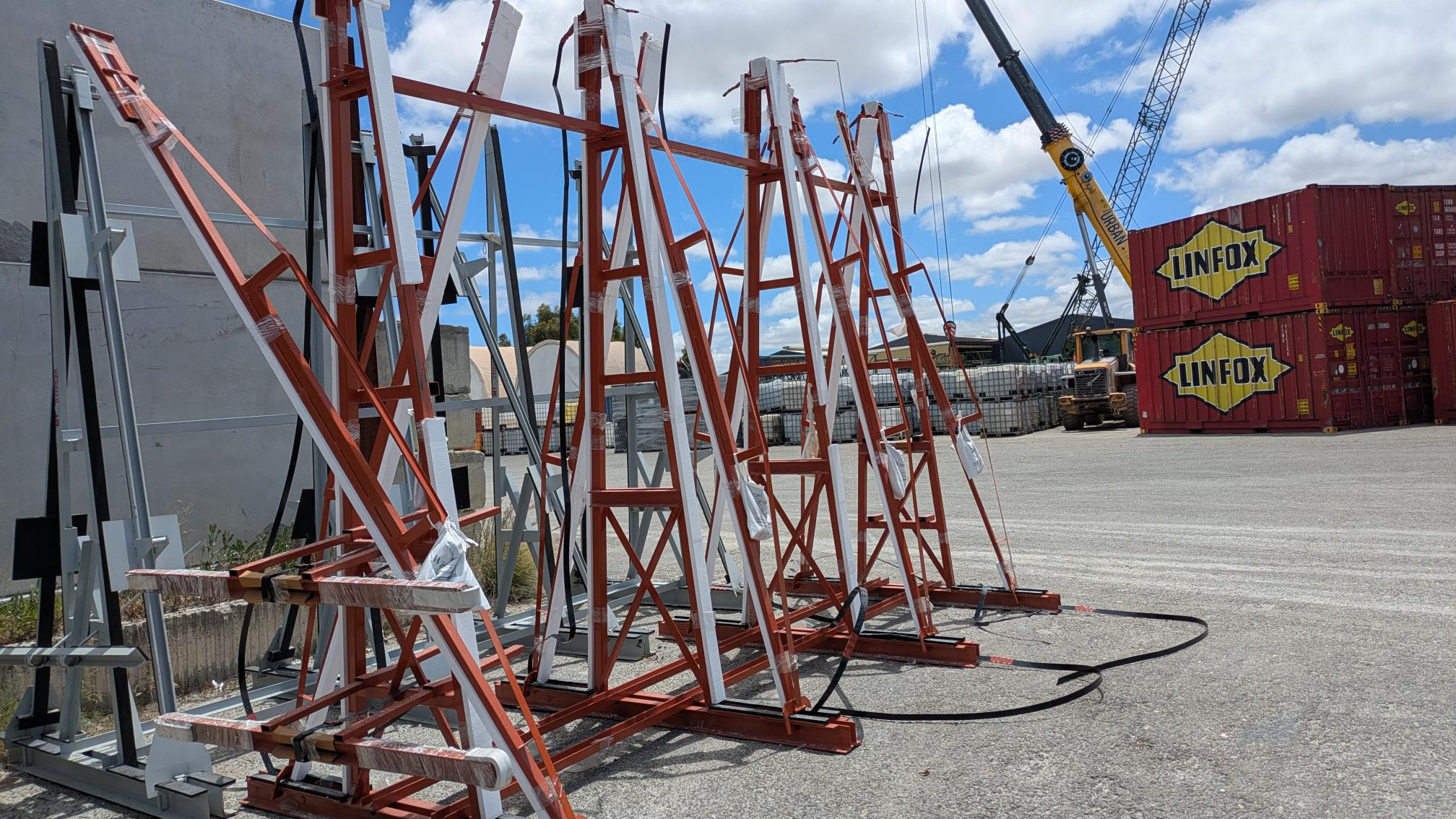 We have two heavy-duty glass A-frame racks available for sale, suitable for stacking glass panels and for secure storage. Previously used for stacking glass panels during container transport.